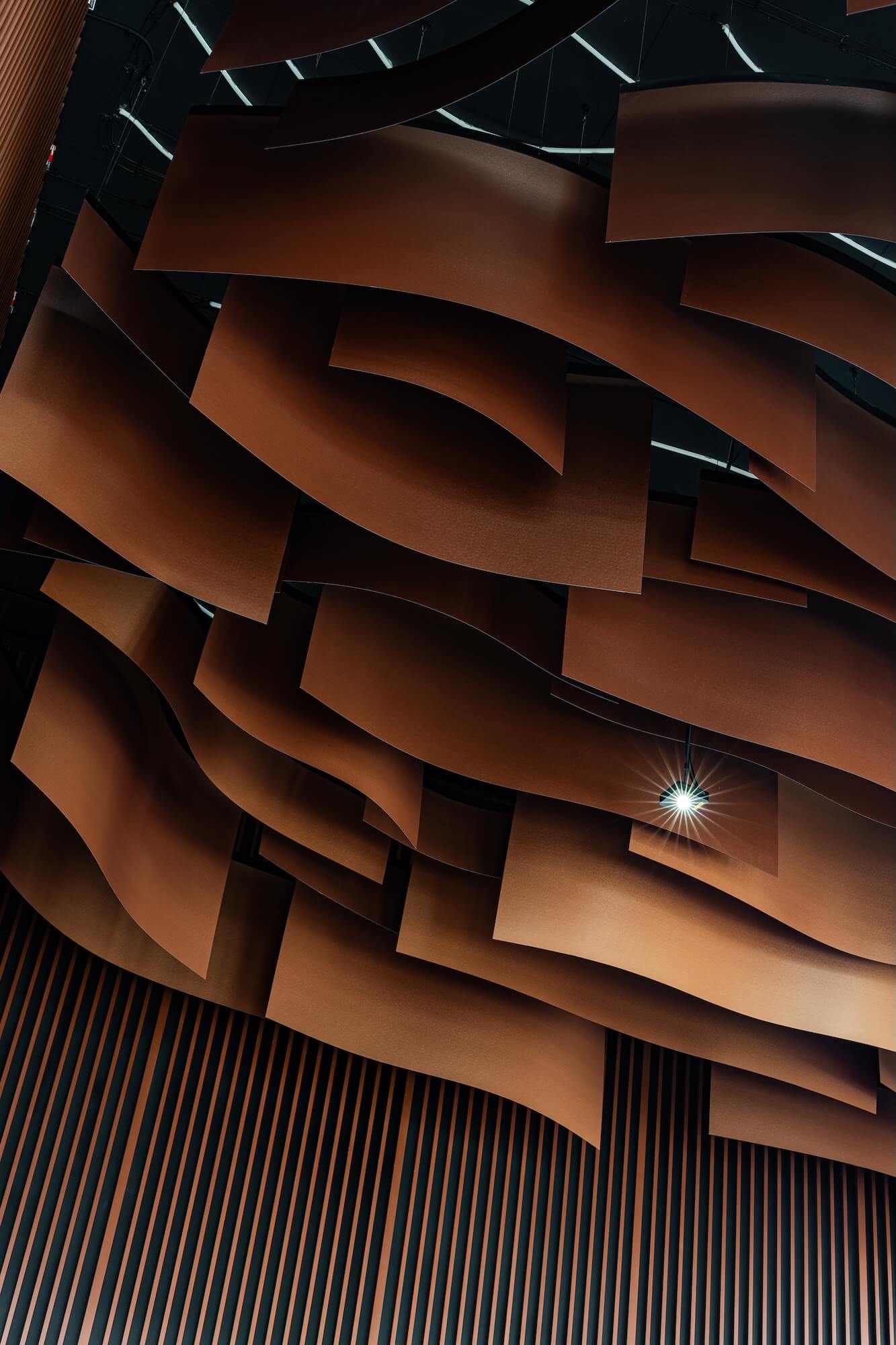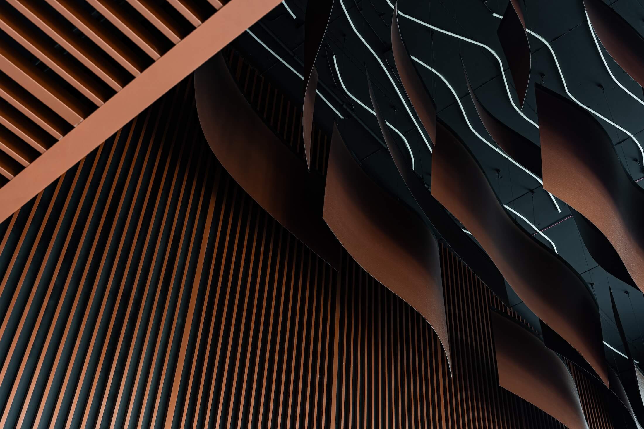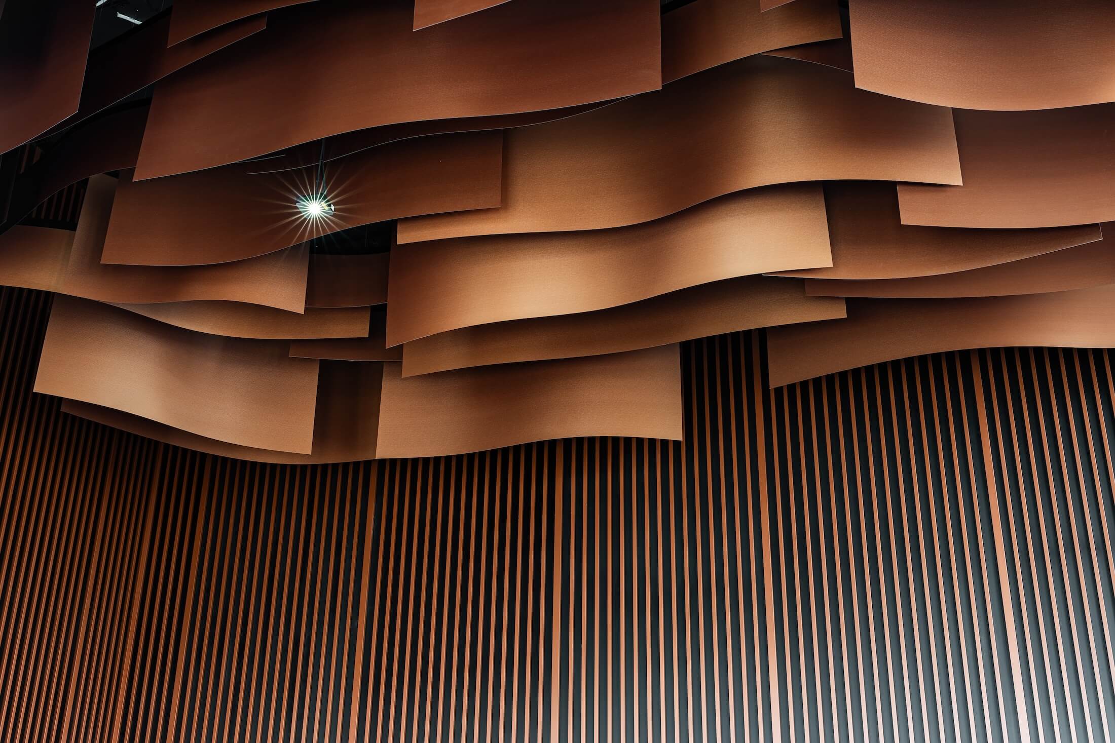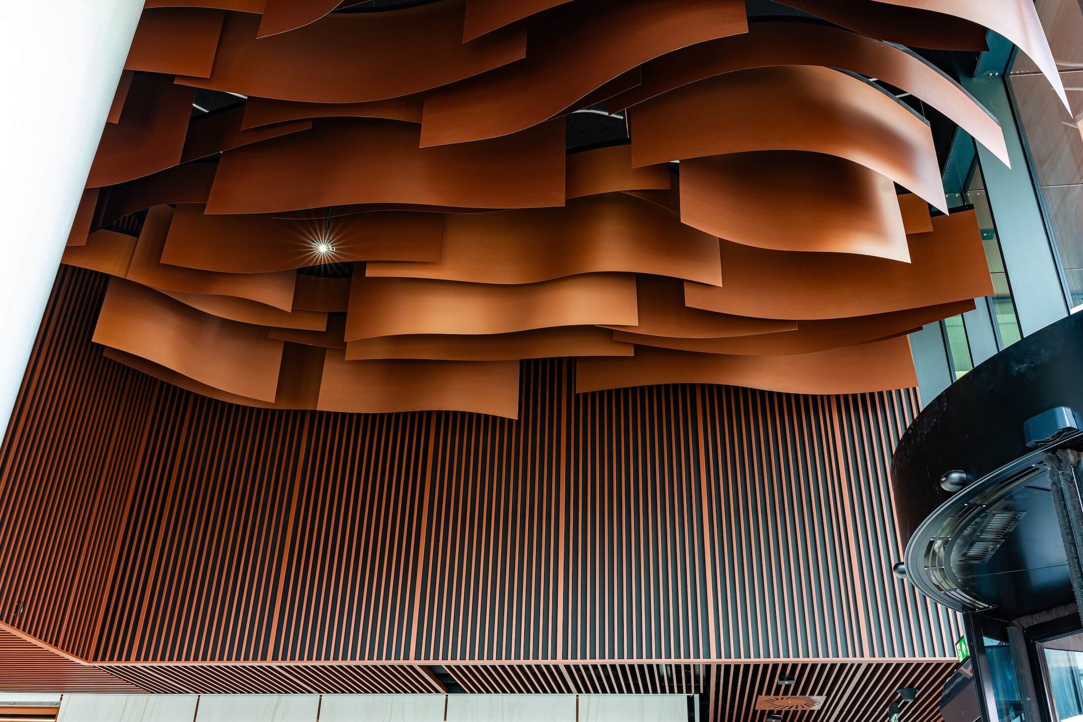 Spersonalizowane elementy wykończeniowe pełnią istotną rolę w budowaniu pierwszego wrażenia, szczególnie w miejscach takich jak recepcje biurowców czy przestrzenie eventowe. Przykładem jest sufitowa instalacja fal w kolorze miedzi w budynku VIBE, której wzór nawiązuje do logotypu inspirowanego dedykowaną ścieżką dźwiękową obiektu. Wykonana została z atestowanych materiałów, instalacja nadaje biurowcowi charakter, tworząc wrażenie elegancji i wyrafinowania, które przyciąga najemców poszukujących prestiżowych lokalizacji.