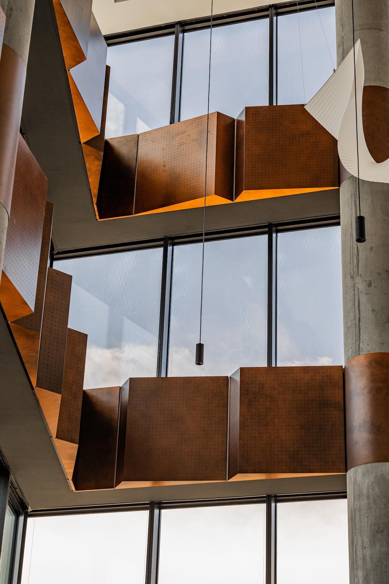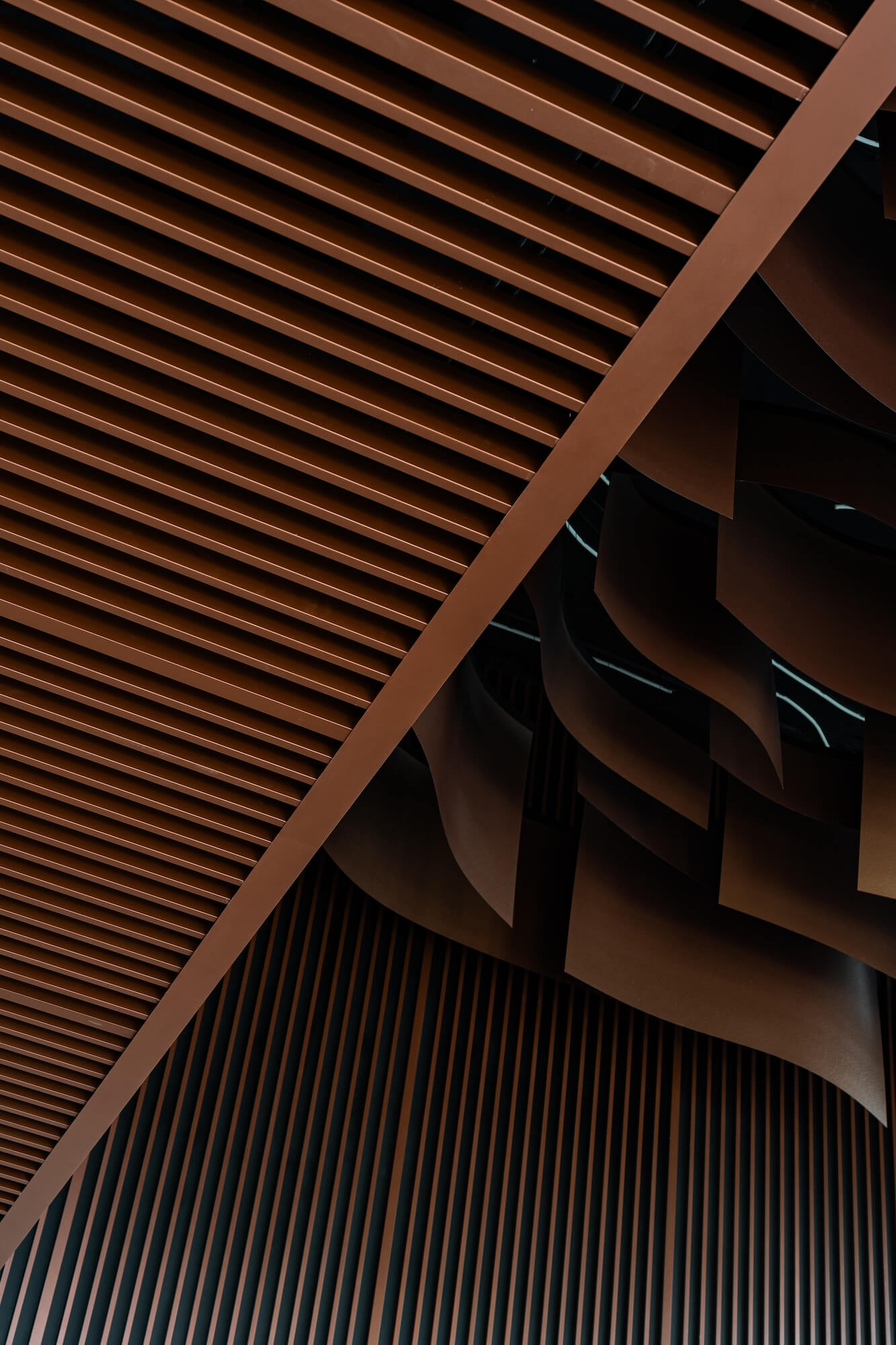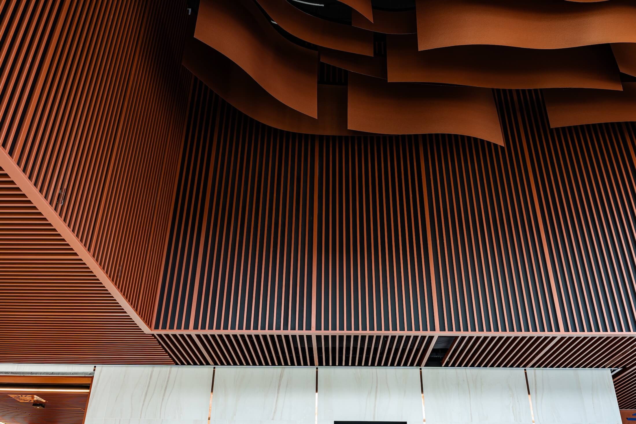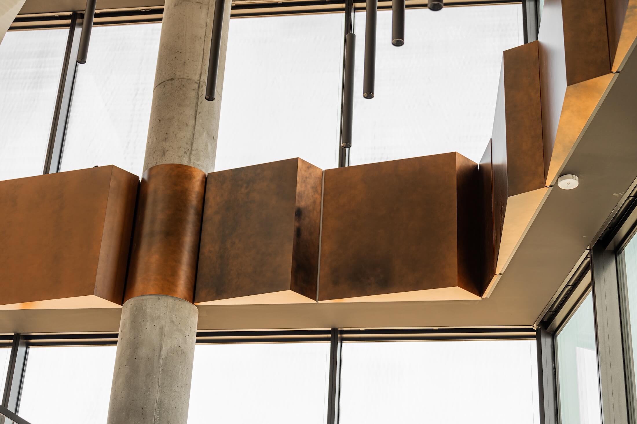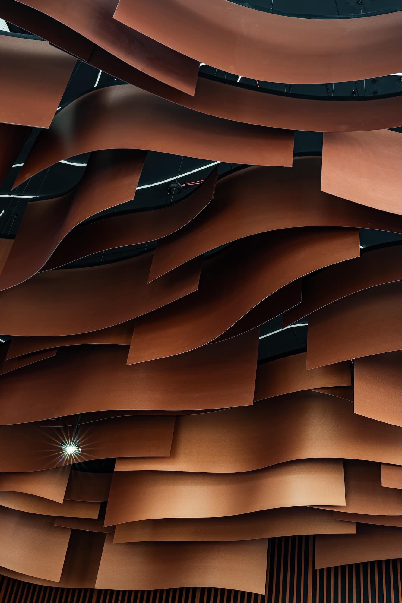 Spersonalizowane elementy wykończeniowe pełnią istotną rolę w budowaniu pierwszego wrażenia, szczególnie w miejscach takich jak recepcje biurowców czy przestrzenie eventowe. Przykładem jest sufitowa instalacja fal w kolorze miedzi w budynku VIBE, której wzór nawiązuje do logotypu inspirowanego dedykowaną ścieżką dźwiękową obiektu. Wykonana została z atestowanych materiałów, instalacja nadaje biurowcowi charakter, tworząc wrażenie elegancji i wyrafinowania, które przyciąga najemców poszukujących prestiżowych lokalizacji.